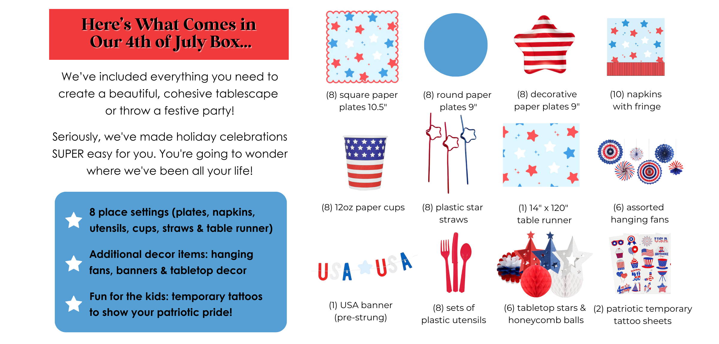 Each of our themed holiday boxes includes everything you need to create a beautiful, cohesive tablescape or throw a festive party. Our Confetti Code boxes make it simple and affordable to celebrate every holiday in style - without the stress and overwhelm!